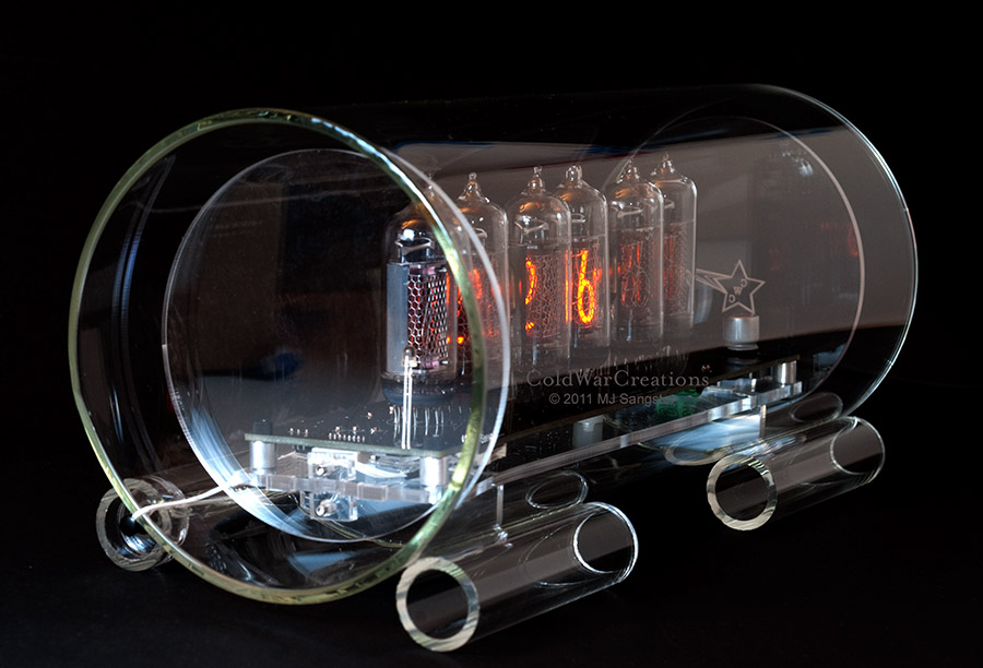 The tubes used in this clock are Russian (Soviet) military tubes. The Soviets, seeing the Western Nixie, came up with their own versions with similar sizes and shapes. Unlike the U.S. Tubes they were manufactured well into the 1980's.